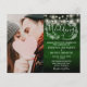 Med fina strängljus och en handritad blomsterkrans, kan denna eleganta rustika kraftbröllopsinbjudan i budgetklass anpassas med ert speciella foto och information i chic typsnitt på en smaragdgrön träpanelbakgrund. Designad av Thisisnotme©