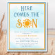 Bjud in familj och vänner till din sol-tema baby shower med denna budget pojkar baby shower inbjudan. Den har texten "Här kommer sonen" i stilren retro typografi med en gul akvarell sol på en blå himmel bakgrund. Lätt att anpassa. Eftersom vi skapar vår egen konst hittar du inte exakt denna bild från andra designers. Original Akvarell © Michele Davies.