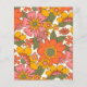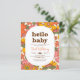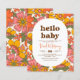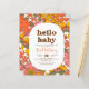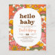 Budget baby shower-kort med modernismens välvda former från mitten av 1900-talet, retroblommor och groovy typografi. Framsidan av detta kort har en blomsterbakgrund med en vit oval överlagring i mitten. Den varma vintagefärgpaletten med bruna, gula, orange, krämfärgade och gröna nyanser ger en riktig 70-talskänsla. Det blommiga tusenskönemönstret är ett handritat, serieinspirerat mönster med djärva färger och starka konturer som matchar hippie-stilen från sjuttiotalet. Inuti den ovala ramen finns evenemangsinformationen i en chic, enkel layout. Texten börjar med "hello baby" i groovy typografi med föräldrarna namn skrivna i en avslappnad orange handstilsstil. Retroinspirerade former och mönster
