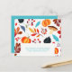 Tilltalande modern Thanksgiving-kort med blad och pumpor i levande färger. Textmallfält på båda sidor säkerställer att du kan skriva ditt årliga uppdateringsbrev till dina vänner och familj. Kuvert ingår ej.