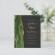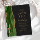 This elegant modern birthday party invitation features a hunter green watercolor agate border trimmed with gold faux glitter. The customizable text combines gold-colored script and sans serif fonts on a slate black background. The reverse side features a matching green and gold agate design.