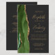 The left-hand edge of this elegant modern wedding invitation features a hunter green watercolor agate border trimmed with faux gold glitter. The customizable text combines gold-colored handwriting, copperplate and italic fonts on an off-black background. Add additional details on the back, along with a QR code to help your guests visit your wedding website.