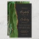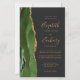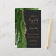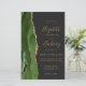 The left-hand edge of this elegant modern wedding invitation features a hunter green watercolor agate border trimmed with faux gold glitter. The customizable text combines gold-colored handwriting, copperplate and italic fonts on an off-black background. The reverse side features a matching hunter green and gold agate design.