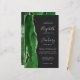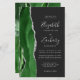 The left-hand edge of this elegant modern wedding invitation features a hunter green watercolor agate border trimmed with faux silver glitter. The customizable text combines silver gray handwriting, copperplate and italic fonts on an off-black background. The reverse side features a matching hunter green and silver agate design.