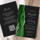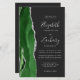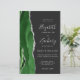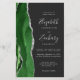 The left-hand edge of this elegant modern wedding invitation features a hunter green watercolor agate border trimmed with faux silver glitter. The customizable text combines silver gray handwriting, copperplate and italic fonts on an off-black background. Add additional details on the back, along with a QR code to help your guests visit your wedding website.