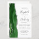 The left-hand edge of this elegant modern wedding invitation features a hunter green watercolor agate border trimmed with faux silver glitter. The customizable text combines charcoal gray handwriting, copperplate and italic fonts on a white background. Add additional details on the back, along with a QR code to help your guests visit your wedding website.