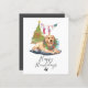BUDGET Glad Hurdagar Gul Labrador Hund Jul vykort från Ricaso - med en bedårande labrador som ligger på en mjuk säng framför en julgran och julstrumpor och med en julkrans med en röd slinga runt halsen