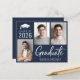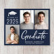 Modern mörkblå budgetvänlig Klass 2025 examenstillkännagivande med 3 bilder och "Graduate" i ett modernt fet stil vitt manus. Lägg till examenens namn och skola eller universitet i enkel vit typografi.