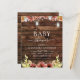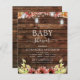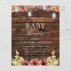 Budget lantlig landsbygd utomhus på mörkt trä med burgunderrött, orange och gula solrosor med murskål på strängljus höst eller höst baby shower inbjudan - inkluderar vacker och elegant skript typografi för den speciella blivande mamman firande.