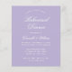 En enkel inbjudan till övningsmiddag med en modern färg: lavendel (lila). Den har bara vit text på lavendelfärgad bakgrund. Orden "Rehearsal Dinner" och namnet är skrivna med ett elegant kalligrafiskt typsnitt.