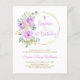 Lila blommor baby första födelsedagsinbjudan med grönt eukalyptus löv & lila vattencolor ro och guldkrans