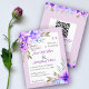 BUDGET lila vattencolor blommor blommigt lilac bröllopsinbjudan med QR-kod för OSA. Den visningar blomketter i lila och blåtoner på hörnen medan texten placeras i ett vitt ram med ett lilaskt gräns. På baksidan finns blommigt- och trädgårdsområden på övre och grund samt QR-koden för OSA.
