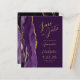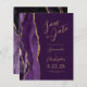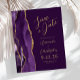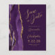 Den vänstra kanten på detta eleganta moderna bröllop sparar datumkortet har en lila akvarell-agat-kant med falskt guldglitter. Den anpassningsbara texten kombinerar guldfärgad skrift och sans serif-teckensnitt på en plommonbakgrund. Baksidan har en matchande lila och guld-agat-design.