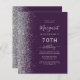 Det moderna födelsedagsfest inbjudan-kant som är lämnat i eleganten har en utformning av silver faux glitter. Anpassadet kombinerar handskrift, tryckplåt och kursivt typsnitt på mörkens lila. Den omvända sidan har en passande lila- och silver glitter-design.
