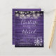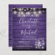 En snyggt rustik inbjudan till budgetbröllop med söt string ljus, Mason burk, namnteckning stil namn och chic typografi på en rustisk lila träbakgrund. Designad av Thisisnotme©