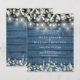 En rustik bröllopsinbjudan på budget med vackra ljuskedjor och salvia- och lilafärgade blad som faller över en blå rustik träpanelbakgrund och era bröllopsdetaljer i klassisk elegant text. Designad av Thisisnotme©