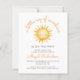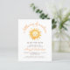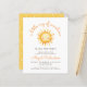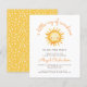Denna söta inbjudan till barnkalas har en akvarellillustration av en sol med ett leende ansikte. Ovanför syns orden "en liten stråle av solsken" i trendig orange handskriven skrift. Anpassa texten med namnet på den blivande mamman i orange skrift och detaljerna i brun sans serif-teckensnitt. Baksidan av kortet har ett mönster av vita handritade stjärnor på en gul bakgrund. Perfekt för pojk- eller flickbarnkalas.