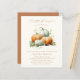 En elegant könsneutral höst-bebis shower-inbjudan med modernt skrivstil Liten Pumpa och redigerbar på väg-text. Den har handmålade akvarellpumpor i nyanser av orange och grönt. Klicka på redigeringsknappen för att anpassa med dina detaljer.