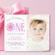 Inbjudan familj och vänner till din första födelsedagsfest med denna söta budgetinbjudan på födelsedagen. Det är dekorerat med en rosa vattenfärg sol och säger "Vår lilla solsken är en" enkelt anpassade. Byt ut fotot mot ett eget. Perfekt för en flickas första födelsedagsfest. Använda Verktyg i Design om du vill ändra texten storlekt, stil eller färg. När vi skapar vår teckning hittar du inte den här bilden från andra designers. Ursprunglig vattenfärg © Michele Davies.