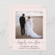 Enkel och chic budgetvänlig ljus rosa utveckling eller mindre tillkännagivande av bröllop och mottagning eller inbjudan till fester efter bröllopet. Framsidan innehåller ditt fotografi, "lyckligtvis efter" skrivet i ett skript för elegant med dekorationer och ditt första datum och plats för namn och bröllop. Anpassa ditt tillkännagivande från bröllop mer i detalj, lägg till en mottagning eller en partiinbjudan och underteckna ditt gifta namn i ett namnteckning skript.