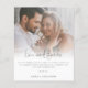 Budget Manus Foto Tacksamhet. Ett budgetpris MINDRE 4,5” x 5,6” alternativ. Finns i en HALVMATT 110 lb KORTPAPPER som är standardalternativet (tjockare för inbjudningar), ELLER en SATINERAD 80 lb TUNNARE PAPPERSKVALITET (idealisk för inklusioner). En modern design för att säga tack efter er förlovningsfest, med informell fast text Tacksamhet, under ert foto högst upp och resten av texten kan ni enkelt anpassa. Välj ett foto av er båda och ersätt provfotot i mallens platshållare med det.