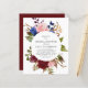 En underbar rustik inbjudningskort för möhippan med text i en vit cirkel omgiven av en vattenfärgad blommigt bouquet i skuggor av Marsala eller burgundy, marinblått och rosa. Den omvända sidan är en matchande skugga av marsala.
