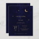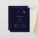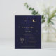 En modern kallelseinbjudan till ett lågprisbröllop har en enkel och elegant utformning. Den innehåller en guld-folie måne och stjärnor som är försiktigt gnistra, mot en midnattsblå bakgrund. Inbjudan användor klassisk serif-typografi, som ger en traditionell och formell kontakt med sitt vackra och tydliga stil. Kombinationen av modern design, blanka detaljer om guld och tidlöst typsnitt gör inbjudan både vacker och inbjudande, perfekt för att tillkännage en speciell dag och elegant bröllop.