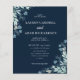 Modern bröllopsinbjudan. Mjuka plommon av rustiskt bladverk och litet blåa blommor på marin blå bakgrund. Enkel att anpassa med din unika information.