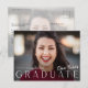 Denna moderna eleganta snygga foto utexamineringsfest inbjudan har en horisontell bild och flyttbar rubrik med anpassningsbart skriptnamn och text på framsidan. Baksidan har en inbjudan med detaljer om examensfesten och ett urblekt horisontellt foto som sträcker sig över hela ytan. Ett bra sätt att visa upp din examen. Klicka på redigeringsknappen för att anpassa denna design.