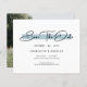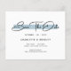Budget Modern Minimalist Script Spara Datum Inbjudningskort har "Spara Datum" i en elegant svart handstil över en modern blå accent på en vit bakgrund med din information om Spara Datum nedan. Anpassa genom att redigera texten i de tillgängliga textrutorna och lägg till ditt favoritfoto på baksidan. Designad för dig av ©Evco Studio www.zazzle.com/store/evcostudio