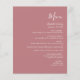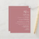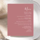 Den här enkla moderna bröllop-menyn har vit text i dammig ro. Ord "Meny" visas i snyggtens handskriftsgrafi. Lägg till parets datum namn och bröllop i skript och kursiv stil, tillsammans med menydetaljer i sans serif-teckensnitt. Den omvända sidan är en passande skugga av massivt dammigt ro.