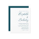 Den här enkla, moderna bröllopsinbjudan har tealblått text på vit bakgrund. Lägg till bildens och bildens namn i snyggtens handskriftsgrafi och detaljerna i sans serif-teckensnitt. Den omvända sidan är en matchande ton av solid teal. Obs! Kuvert inkluderas inte automatiskt i dessa budgetinbjudningar, så kom ihåg att välja alternativet "vita kuvert"!