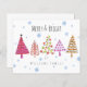 Skicka ett personligt julkort med budgetvänlig design till familj och vänner denna säsong som har fantasifulla vattenfärgade julgranar i rött, grönt och rosa med blå snöflingor. Det står "Glada & Lysande". Nedan i svart text står ditt familjenamn för att göra det personligt. Designat av den världsberömda konstnären Tim Coffey.