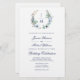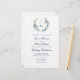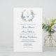 Budgetbröllopsinbjudan. Modern vattenfärgsgrafik med ett vackert ram av anemonblommor, vattenskog, sköldpadda, eukalyptus, löv. Teckensnittskombination för elegant. Ursprungligt färg-tema: teal, ljusblå, djupblått, ljust grönt, beige, ecru, vitt. Djupt blå silkesfärgen vinkar på baksidan. Perfekt för elegant i det moderna bröllop.