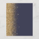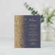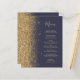 Den moderna bröllop-menyn på den lämnat kant i eleganten har en guld faux glitter gräns. Anpassadet kombinerar guld-färgad visstilskript för handskrift och koppelformat typsnitt på mörk blått bakgrund. Den omvända sidan har en passande mörk blått utformning och guld glitter.