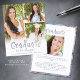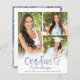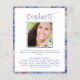 Ett budgetvänligt, modernt examensmeddelande tryckt på 4,5x5,6-tums lättvikts papper istället för kartong med en flerfärgad penseldrag GRADUATE-titel på framsidan och 4 foton (en fotokollage med 3 bilder på framsidan och 1 på baksidan). Baksidan erbjuder ett valfritt textfält för att anpassa med din egen information om din examen. Perfekt för konservativa budgetar och/eller för handleverans. HJÄLP: För hjälp med designändring/personalisering, färgbyte, överföring av designen till en annan produkt eller om du vill ha koordinerade föremål, kontakta designern INNAN du beställer via Zazzle Chat eller makeitaboutyoustore@gmail.com.