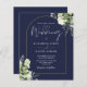 Denna budgetvänliga eleganta botaniska grönska blad bröllopsinbjudan kan anpassas med din information i chic typografi med dina monogram initialer på baksidan på en marinblå bakgrund. Designad av Thisisnotme©