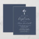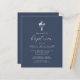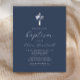 Denna eleganta dopinbjudan har en akvarellbukett med dammig blåa och marinblå blommor och silvergrönska på ett silverfärgat falskt foliekors, ovanför orden "vänligen kom och dela med er av dopet av vår son" i elegant vit handskriven kalligrafi och kursiv stil på en marinblå bakgrund. Personifiera den med namnet i vit skrivstil och detaljerna i sans serif-teckensnitt. Baksidan av kortet är enfärgat marinblått. Perfekt för en pojkes dop.