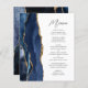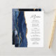 Den vänstra kanten på denna eleganta moderna bröllopsmeny har en marinblå akvarell agatdesign med falskt guld glitter. Den anpassningsbara texten kombinerar kolgrå handskriven skrift och sans serif-teckensnitt på en vit bakgrund. Den marinblå och guld agatdesignen upprepas på baksidan.