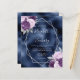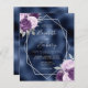 Den här elegantens moderna bröllopsinbjudan innehåller en silver-geometrisk ram som dekoreras med lilac-, lila- och silver-blommigt-buketter på en marin blå faux-folie. I anpassadet kombineras silver grått med fysisk handskrift, tryckplåt och kursivt typsnitt.