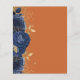 Den vänstra kanten på denna eleganta moderna bröllopsmeny har en marinblå blomsterbukett med guld falska blad och gnistrande guld falskt glitter. Den anpassningsbara texten kombinerar blek guldfärgad handskriven script, kopparplåt och kursiv stil på en bränd orange bakgrund. Baksidan har en matchande blommig design.