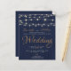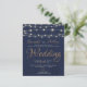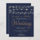 Enkel och modern inbjudan till bröllopet. Guld och vit kalligrafi på en marin blå bakgrund med söt sträng ljus som dekorerar designens överkant. Innehåller även information om OSA och är enkelt att anpassa med dina egna uppgifter.