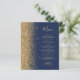 Den vänstra kanten på denna eleganta moderna bröllopsmeny har en falsk guldglitterkant. Den anpassningsbara texten kombinerar guldliknande handskriven skrift och kopparplåtstypsnitt på en marinblå bakgrund. Baksidan har en matchande marinblå och guld glitterdesign.