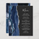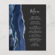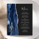 Den vänstra kanten på denna eleganta moderna bröllopsmeny har en navyblå akvarell-agat kant med falskt silverglitter. Den anpassningsbara texten kombinerar handskriven skrift och kopparplåtstypsnitt i silvergrått på en off-black bakgrund. Baksidan har en matchande navyblå och silver agat-design.