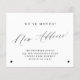 Enkel elegant minimalistisk svart-vit kalligrafi ny adress budget prisvärd flyttmeddelande. +++++++++++ Lätt att anpassa med din nya hemadress! ++++++++++ LÄS DETTA INNAN KÖP! Detta är ett budgetvänligt bröllopskort tryckt på ett pappersark (varje ark har ett kort). ++++++ Om du behöver kuvert, välj KUVERTALTERNATIV. +++ Dubbelkontrollera all information och stavning av din text eftersom du kommer att få exakt vad du ser - ingen annan kommer att kontrollera någonting innan tryckning. ++++ Detta kort är designat för storlek 11,4 cm x 14,2 cm. Om du väljer en annan storlek på kortet och texten hamnar utanför sidan, måste allt korrigeras innan produkten läggs i varukorgen.