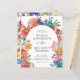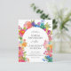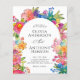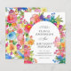 Bröllopsinbjudans design är elegant och livfull, med en glad vattenfärg blommig ram som tillför värme och charm samtidigt som den inramar texten vackert. Typografin kombinerar ett sofistikerat serif-teckensnitt för namnen med ett delikat skrivstil för "Och", vilket skapar visuellt intresse. Textens centrala justering säkerställer ett rent och formellt utseende, vilket gör detaljerna lätta att läsa. De pastella och livliga blomfärgerna kompletterar det romantiska temat och tillför en festlig och livlig touch.