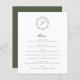 Denna eleganta bröllopsmeny har en klassisk initialmonogram omgiven av en olivgrön linjekonst bladkrans. Ersätt den olivgröna exempeltexten med detaljerna från er mottagningsmeny. Baksidan är enfärgat olivgrön.