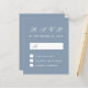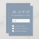 En enkel, minimalistisk OSA av budgeten för ett bröllop. Den har bara vit text på dammig blå bakgrund. Rubriken OSA och brev M skrivs i ett kalligrafiskt skript för elegant, resten i versaler.