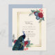 Vacker påfågel med turkos och blå, burgunderfärgade blommor, salvia gröna blad visas på dessa höst, vinter bröllopsdetaljer. Del av en större samling som inkluderar budget bröllopsinbjudningar, spara datum-kort, RSVP, tack-fotokort, brud- och bröllopsgåvor, med mera. För en detaljerad GRATIS vinterbröllopsplanering, besök weddingdesignchic.com.