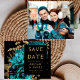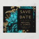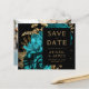 Den här eleganten har det moody bröllop spara datum-kortet en lush, romantisk blommigt buquet i turkos med guld faux foil och glitter foliage mot svart bakgrund. Anpassa guld-färgad-texten i snyggt typsnitt på en svart rektangel och lägg till vågräts favoritbild på baksidan.